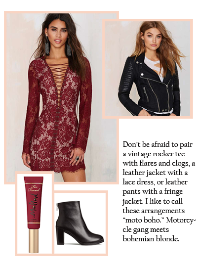 Lace and crochet scream boho! I tend to be very picky about my lace and crochet designs, but when I find something I like, I buy it and love it. Pair your lace flares with a halter top and simple sandals with round sunnies and wavy hair… you are so cute! Style a neutral crochet crop top, layered with a lace bralette, solid knit bells and a silver concho belt with these Jeffrey Campbell clogs.